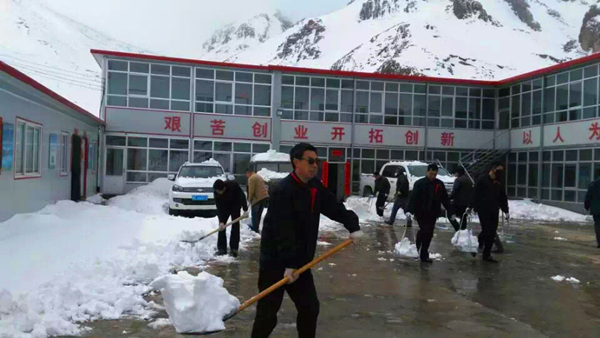 2016年3月21日青海共和縣青海銅鑫礦業(yè)有限公司礦區(qū)迎來了自春節(jié)以來的第一場(chǎng)大雪,前幾這里還太陽高照,天氣晴朗,與此同時(shí)洛陽陽光明媚,鳥語花香,現(xiàn)在青海銅鑫礦區(qū)則被厚厚的白雪覆蓋,呈現(xiàn)出另一番別樣的景像。青海分公司員工也一起參加礦山工作區(qū)的除雪工作,個(gè)個(gè)干得熱火朝天,一會(huì)兒大院里的雪就被清理完畢。