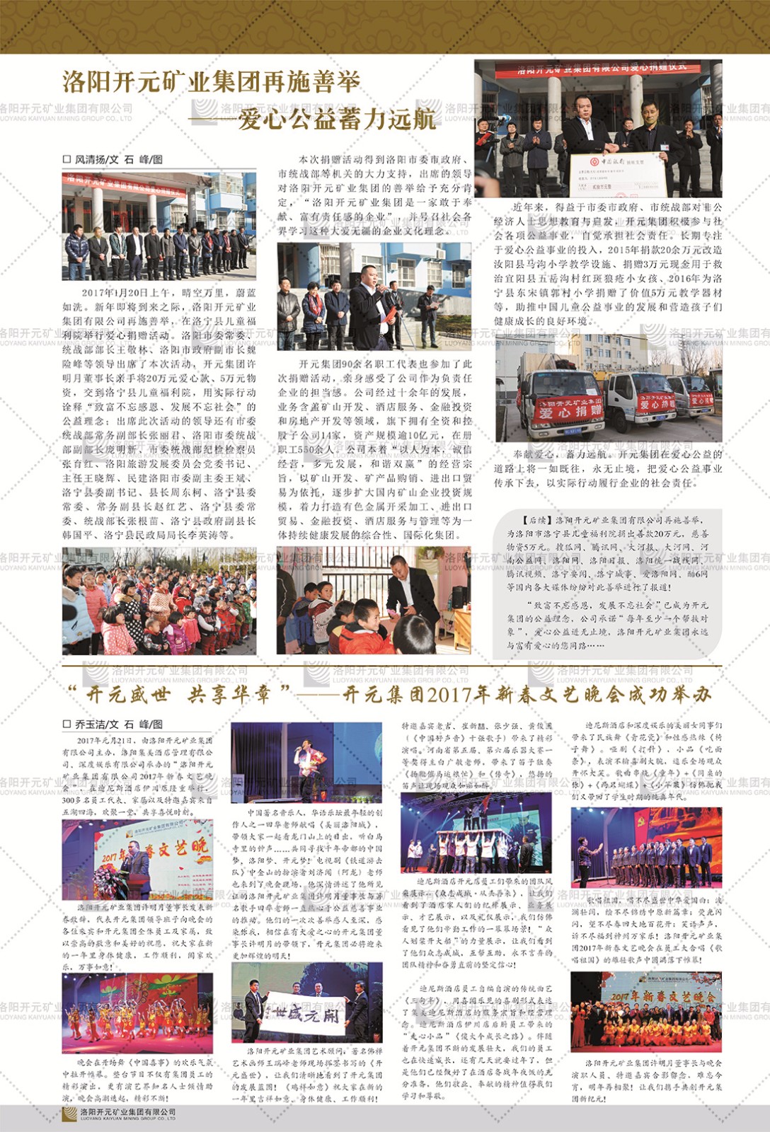洛陽(yáng)開(kāi)元礦業(yè)集團(tuán)有限公司簡(jiǎn)介洛陽(yáng)開(kāi)元礦業(yè)集團(tuán)有限公司,始成立于2006年,位于洛陽(yáng)市開(kāi)元大道269號(hào)。集團(tuán)旗下共有五余家全資子公司,業(yè)務(wù)涉及有色金屬礦山開(kāi)發(fā)、礦產(chǎn)品購(gòu)銷(xiāo)與進(jìn)出口貿(mào)易、房地產(chǎn)開(kāi)發(fā)、文化藝術(shù)、企業(yè)管理與咨詢、資本投資等多個(gè)領(lǐng)域。民建河南省委委員、民建河南省委企業(yè)委副主任、民建洛陽(yáng)市委委員、企業(yè)委主任、洛陽(yáng)民建企業(yè)家協(xié)會(huì)會(huì)長(zhǎng)許明月是公司創(chuàng)始人,現(xiàn)任洛陽(yáng)開(kāi)元礦業(yè)集團(tuán)有限公司董事長(zhǎng)。在礦業(yè)領(lǐng)域,洛陽(yáng)開(kāi)元礦業(yè)集團(tuán)擁有多家實(shí)力雄厚的子公司:貴州開(kāi)元礦業(yè)有限公司探、采礦權(quán)面積共11.33平方公里;興海縣銅鑫礦業(yè)有限公司探礦權(quán)面積8.76平方公里,礦山資源潛力巨大;2021年,開(kāi)元集團(tuán)與盧氏中科礦業(yè)有限公司開(kāi)展戰(zhàn)略合作。盧氏中科礦業(yè)有限公司專(zhuān)注于有色金屬的浮選、加工和銷(xiāo)售,擁有強(qiáng)大的技術(shù)支撐平臺(tái),是集探、采、選、冶、研為一體的中大型綜合礦業(yè)企業(yè)。目前,盧氏中科王家河1000噸選礦廠已成功投產(chǎn),雙河金礦、柳關(guān)欒盧鉛鋅礦相繼順利開(kāi)工,樓房銀礦與圪老灣鉛鋅礦的深部探礦重大突破,標(biāo)志著礦山版圖取得重大進(jìn)展,為開(kāi)元集團(tuán)后續(xù)發(fā)展奠定了堅(jiān)實(shí)基礎(chǔ)。在文化傳媒領(lǐng)域,洛陽(yáng)市明月美術(shù)館通過(guò)豐富多樣的藝術(shù)展覽、學(xué)術(shù)研討和公共教育活動(dòng),努力打造一個(gè)集展覽、交流、教育、研究為一體的綜合性藝術(shù)平臺(tái)。此外,在金融投資領(lǐng)域,開(kāi)元集團(tuán)旗下的北京明峰資本管理有限公司專(zhuān)注于投資具有高增長(zhǎng)潛力的優(yōu)秀企業(yè),特別是高科技、新能源、環(huán)保等新興產(chǎn)業(yè),為客戶提供個(gè)性化的資產(chǎn)配置服務(wù)。在做好企業(yè)經(jīng)營(yíng)的同時(shí),開(kāi)元集團(tuán)始終不忘企業(yè)的社會(huì)責(zé)任和家國(guó)情懷,以突出的愛(ài)心公益事跡,開(kāi)展了一系列公益慈善活動(dòng):“民建林”公益事業(yè)通過(guò)“思源基金”“幫幫公益”線上公益平臺(tái),與眾多愛(ài)心人士籌措資金20余萬(wàn)元;資助541名貧困大學(xué)生共計(jì)270余萬(wàn)元,推進(jìn)“數(shù)字助力——河南AI人才培養(yǎng)”;捐款10萬(wàn)元,馳援京津冀、黑龍江洪水地質(zhì)災(zāi)害……公司于2017年底被洛陽(yáng)市慈善總會(huì)評(píng)為“洛陽(yáng)慈善風(fēng)云榜——十大愛(ài)心集體”。洛陽(yáng)開(kāi)元礦業(yè)集團(tuán)有限公司秉承持續(xù)發(fā)展理念,憑借多年來(lái)良好的企業(yè)信譽(yù)與經(jīng)營(yíng)業(yè)績(jī),與全國(guó)多家企業(yè)建立了良好合作關(guān)系,受到社會(huì)各界的一致好評(píng),多次榮獲“納稅標(biāo)兵”“先進(jìn)企業(yè)”“招商引資模范企業(yè)”等榮譽(yù)稱號(hào)。回望來(lái)時(shí)路,開(kāi)元人勠力同心,以“闖”的精神和“創(chuàng)”的勁頭,一路披荊斬棘,踏過(guò)千山萬(wàn)水;展望新未來(lái),開(kāi)元人凝心聚力,不執(zhí)于“舊”,無(wú)畏于“新”,秉承“勇于跨越,追求卓越”的企業(yè)精神,乘著國(guó)家高質(zhì)量發(fā)展新征程的東風(fēng),跨過(guò)高山,越過(guò)大海,向著集團(tuán)多元化、國(guó)際化的目標(biāo),逐夢(mèng)遠(yuǎn)航,跨越前行!