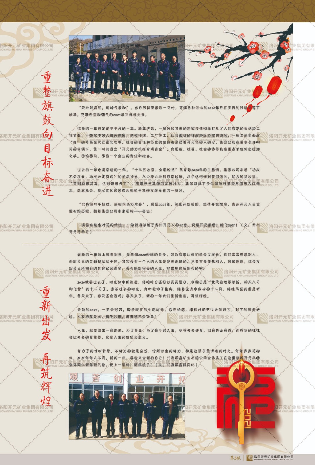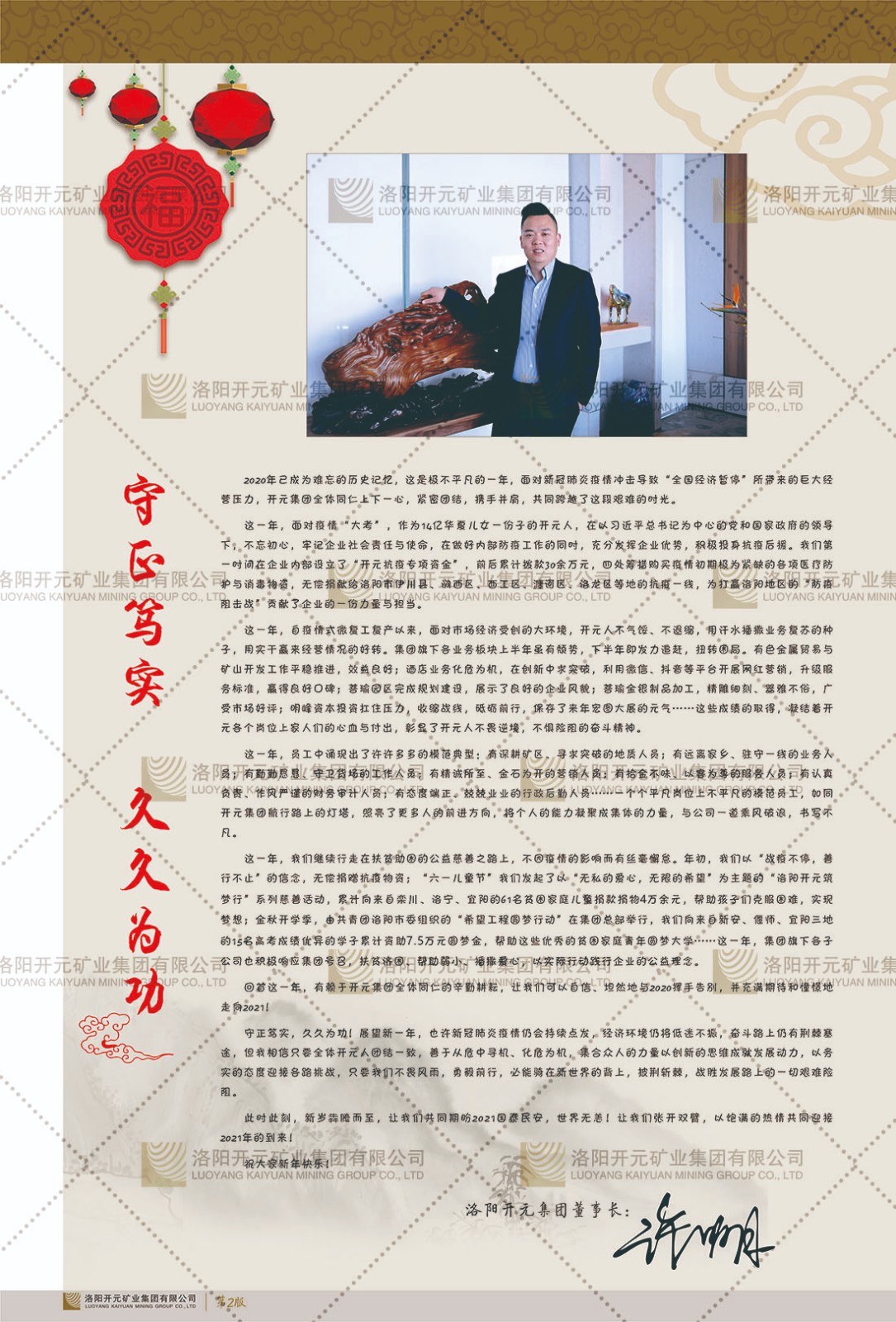 洛陽開元礦業(yè)集團(tuán)有限公司簡介洛陽開元礦業(yè)集團(tuán)有限公司,始成立于2006年,位于洛陽市開元大道269號(hào)。集團(tuán)旗下共有五余家全資子公司,業(yè)務(wù)涉及有色金屬礦山開發(fā)、礦產(chǎn)品購銷與進(jìn)出口貿(mào)易、房地產(chǎn)開發(fā)、文化藝術(shù)、企業(yè)管理與咨詢、資本投資等多個(gè)領(lǐng)域。民建河南省委委員、民建河南省委企業(yè)委副主任、民建洛陽市委委員、企業(yè)委主任、洛陽民建企業(yè)家協(xié)會(huì)會(huì)長許明月是公司創(chuàng)始人,現(xiàn)任洛陽開元礦業(yè)集團(tuán)有限公司董事長。在礦業(yè)領(lǐng)域,洛陽開元礦業(yè)集團(tuán)擁有多家實(shí)力雄厚的子公司:貴州開元礦業(yè)有限公司探、采礦權(quán)面積共11.33平方公里;興??h銅鑫礦業(yè)有限公司探礦權(quán)面積8.76平方公里,礦山資源潛力巨大;2021年,開元集團(tuán)與盧氏中科礦業(yè)有限公司開展戰(zhàn)略合作。盧氏中科礦業(yè)有限公司專注于有色金屬的浮選、加工和銷售,擁有強(qiáng)大的技術(shù)支撐平臺(tái),是集探、采、選、冶、研為一體的中大型綜合礦業(yè)企業(yè)。目前,盧氏中科王家河1000噸選礦廠已成功投產(chǎn),雙河金礦、柳關(guān)欒盧鉛鋅礦相繼順利開工,樓房銀礦與圪老灣鉛鋅礦的深部探礦重大突破,標(biāo)志著礦山版圖取得重大進(jìn)展,為開元集團(tuán)后續(xù)發(fā)展奠定了堅(jiān)實(shí)基礎(chǔ)。在文化傳媒領(lǐng)域,洛陽市明月美術(shù)館通過豐富多樣的藝術(shù)展覽、學(xué)術(shù)研討和公共教育活動(dòng),努力打造一個(gè)集展覽、交流、教育、研究為一體的綜合性藝術(shù)平臺(tái)。此外,在金融投資領(lǐng)域,開元集團(tuán)旗下的北京明峰資本管理有限公司專注于投資具有高增長潛力的優(yōu)秀企業(yè),特別是高科技、新能源、環(huán)保等新興產(chǎn)業(yè),為客戶提供個(gè)性化的資產(chǎn)配置服務(wù)。在做好企業(yè)經(jīng)營的同時(shí),開元集團(tuán)始終不忘企業(yè)的社會(huì)責(zé)任和家國情懷,以突出的愛心公益事跡,開展了一系列公益慈善活動(dòng):“民建林”公益事業(yè)通過“思源基金”“幫幫公益”線上公益平臺(tái),與眾多愛心人士籌措資金20余萬元;資助541名貧困大學(xué)生共計(jì)270余萬元,推進(jìn)“數(shù)字助力——河南AI人才培養(yǎng)”;捐款10萬元,馳援京津冀、黑龍江洪水地質(zhì)災(zāi)害……公司于2017年底被洛陽市慈善總會(huì)評(píng)為“洛陽慈善風(fēng)云榜——十大愛心集體”。洛陽開元礦業(yè)集團(tuán)有限公司秉承持續(xù)發(fā)展理念,憑借多年來良好的企業(yè)信譽(yù)與經(jīng)營業(yè)績,與全國多家企業(yè)建立了良好合作關(guān)系,受到社會(huì)各界的一致好評(píng),多次榮獲“納稅標(biāo)兵”“先進(jìn)企業(yè)”“招商引資模范企業(yè)”等榮譽(yù)稱號(hào)?;赝麃頃r(shí)路,開元人勠力同心,以“闖”的精神和“創(chuàng)”的勁頭,一路披荊斬棘,踏過千山萬水;展望新未來,開元人凝心聚力,不執(zhí)于“舊”,無畏于“新”,秉承“勇于跨越,追求卓越”的企業(yè)精神,乘著國家高質(zhì)量發(fā)展新征程的東風(fēng),跨過高山,越過大海,向著集團(tuán)多元化、國際化的目標(biāo),逐夢遠(yuǎn)航,跨越前行!