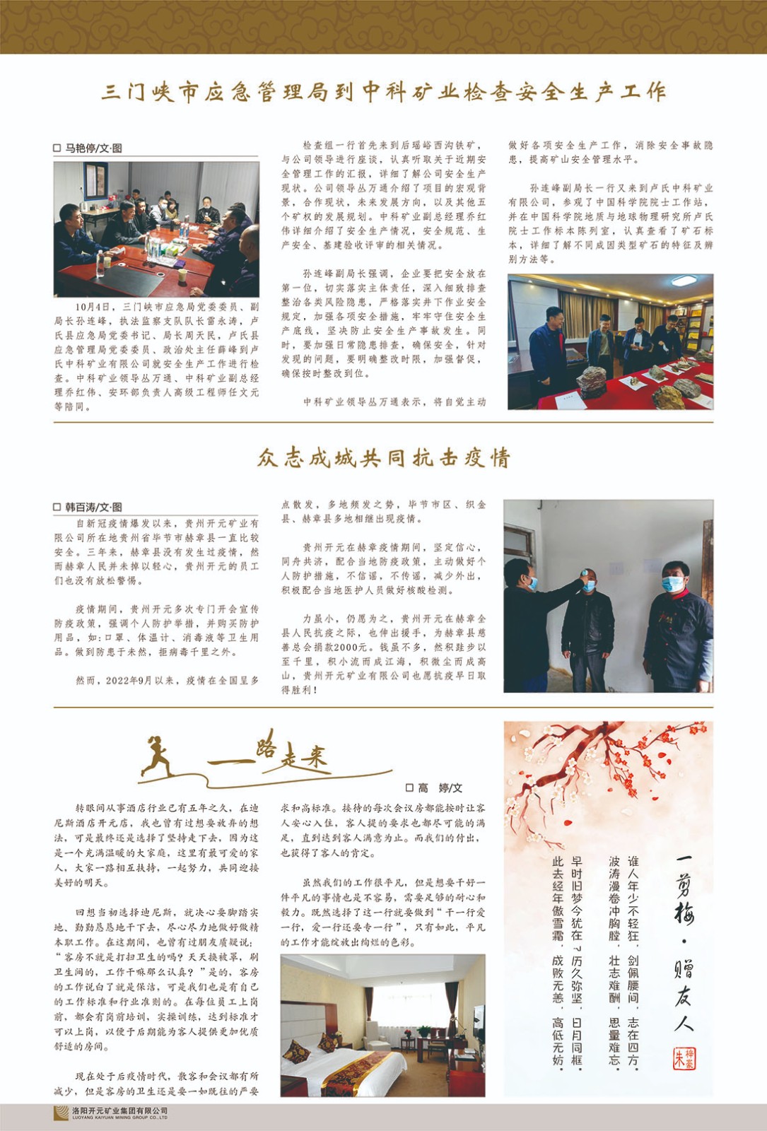 洛陽(yáng)開(kāi)元礦業(yè)集團(tuán)有限公司簡(jiǎn)介洛陽(yáng)開(kāi)元礦業(yè)集團(tuán)有限公司,始成立于2006年,位于洛陽(yáng)市開(kāi)元大道269號(hào)。集團(tuán)旗下共有五余家全資子公司,業(yè)務(wù)涉及有色金屬礦山開(kāi)發(fā)、礦產(chǎn)品購(gòu)銷(xiāo)與進(jìn)出口貿(mào)易、房地產(chǎn)開(kāi)發(fā)、文化藝術(shù)、企業(yè)管理與咨詢(xún)、資本投資等多個(gè)領(lǐng)域。民建河南省委委員、民建河南省委企業(yè)委副主任、民建洛陽(yáng)市委委員、企業(yè)委主任、洛陽(yáng)民建企業(yè)家協(xié)會(huì)會(huì)長(zhǎng)許明月是公司創(chuàng)始人,現(xiàn)任洛陽(yáng)開(kāi)元礦業(yè)集團(tuán)有限公司董事長(zhǎng)。在礦業(yè)領(lǐng)域,洛陽(yáng)開(kāi)元礦業(yè)集團(tuán)擁有多家實(shí)力雄厚的子公司:貴州開(kāi)元礦業(yè)有限公司探、采礦權(quán)面積共11.33平方公里;興海縣銅鑫礦業(yè)有限公司探礦權(quán)面積8.76平方公里,礦山資源潛力巨大;2021年,開(kāi)元集團(tuán)與盧氏中科礦業(yè)有限公司開(kāi)展戰(zhàn)略合作。盧氏中科礦業(yè)有限公司專(zhuān)注于有色金屬的浮選、加工和銷(xiāo)售,擁有強(qiáng)大的技術(shù)支撐平臺(tái),是集探、采、選、冶、研為一體的中大型綜合礦業(yè)企業(yè)。目前,盧氏中科王家河1000噸選礦廠(chǎng)已成功投產(chǎn),雙河金礦、柳關(guān)欒盧鉛鋅礦相繼順利開(kāi)工,樓房銀礦與圪老灣鉛鋅礦的深部探礦重大突破,標(biāo)志著礦山版圖取得重大進(jìn)展,為開(kāi)元集團(tuán)后續(xù)發(fā)展奠定了堅(jiān)實(shí)基礎(chǔ)。在文化傳媒領(lǐng)域,洛陽(yáng)市明月美術(shù)館通過(guò)豐富多樣的藝術(shù)展覽、學(xué)術(shù)研討和公共教育活動(dòng),努力打造一個(gè)集展覽、交流、教育、研究為一體的綜合性藝術(shù)平臺(tái)。此外,在金融投資領(lǐng)域,開(kāi)元集團(tuán)旗下的北京明峰資本管理有限公司專(zhuān)注于投資具有高增長(zhǎng)潛力的優(yōu)秀企業(yè),特別是高科技、新能源、環(huán)保等新興產(chǎn)業(yè),為客戶(hù)提供個(gè)性化的資產(chǎn)配置服務(wù)。在做好企業(yè)經(jīng)營(yíng)的同時(shí),開(kāi)元集團(tuán)始終不忘企業(yè)的社會(huì)責(zé)任和家國(guó)情懷,以突出的愛(ài)心公益事跡,開(kāi)展了一系列公益慈善活動(dòng):“民建林”公益事業(yè)通過(guò)“思源基金”“幫幫公益”線(xiàn)上公益平臺(tái),與眾多愛(ài)心人士籌措資金20余萬(wàn)元;資助541名貧困大學(xué)生共計(jì)270余萬(wàn)元,推進(jìn)“數(shù)字助力——河南AI人才培養(yǎng)”;捐款10萬(wàn)元,馳援京津冀、黑龍江洪水地質(zhì)災(zāi)害……公司于2017年底被洛陽(yáng)市慈善總會(huì)評(píng)為“洛陽(yáng)慈善風(fēng)云榜——十大愛(ài)心集體”。洛陽(yáng)開(kāi)元礦業(yè)集團(tuán)有限公司秉承持續(xù)發(fā)展理念,憑借多年來(lái)良好的企業(yè)信譽(yù)與經(jīng)營(yíng)業(yè)績(jī),與全國(guó)多家企業(yè)建立了良好合作關(guān)系,受到社會(huì)各界的一致好評(píng),多次榮獲“納稅標(biāo)兵”“先進(jìn)企業(yè)”“招商引資模范企業(yè)”等榮譽(yù)稱(chēng)號(hào)?;赝麃?lái)時(shí)路,開(kāi)元人勠力同心,以“闖”的精神和“創(chuàng)”的勁頭,一路披荊斬棘,踏過(guò)千山萬(wàn)水;展望新未來(lái),開(kāi)元人凝心聚力,不執(zhí)于“舊”,無(wú)畏于“新”,秉承“勇于跨越,追求卓越”的企業(yè)精神,乘著國(guó)家高質(zhì)量發(fā)展新征程的東風(fēng),跨過(guò)高山,越過(guò)大海,向著集團(tuán)多元化、國(guó)際化的目標(biāo),逐夢(mèng)遠(yuǎn)航,跨越前行!